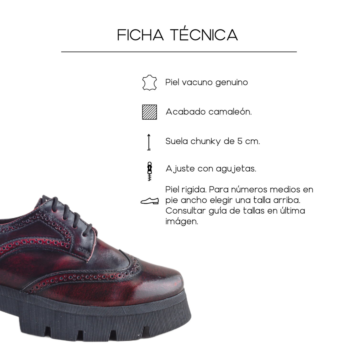 Bostoniano De Piel Vacuno diseñado para la mujer contemporánea que busca estilo sin renunciar a la comodidad. Elaborado en piel vacuno genuina con un acabado camaleón vino, ofrece un efecto bicolor sofisticado que resalta en cualquier look. Su suela chunky de 5 cm no solo brinda altura y firmeza, sino que también aporta un aire moderno que transforma este clásico en un calzado versátil y de tendencia. Ideal para combinar en ocasiones casuales y semiformal, es una pieza que destaca por su diseño artesanal y carácter único.Da click para valorar