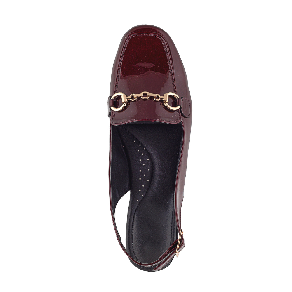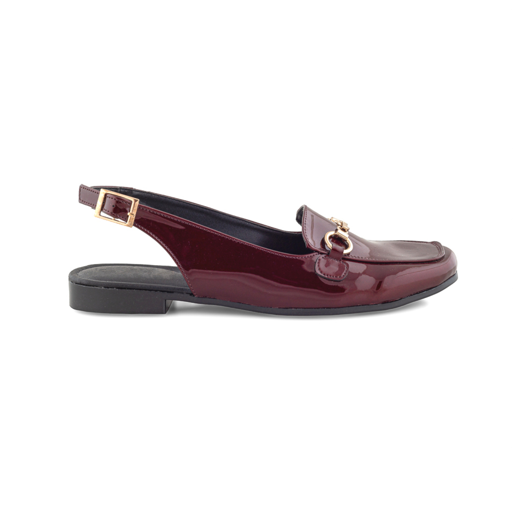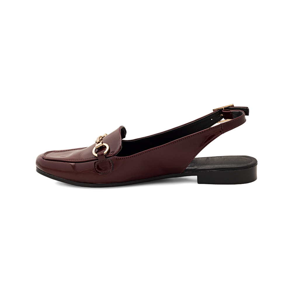 Mocasín de charol brillante en color vino, una pieza clásica reinventada para la mujer contemporánea. Su hebilla lateral ajustable y herraje dorado combinan distinción y practicidad, mientras que su plantilla acolchada garantiza confort durante todo el día. Una opción ideal para quienes buscan elegancia atemporal con un toque moderno.