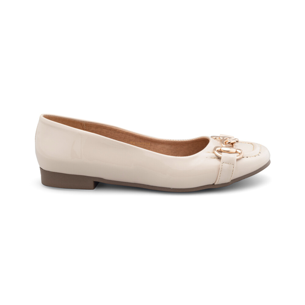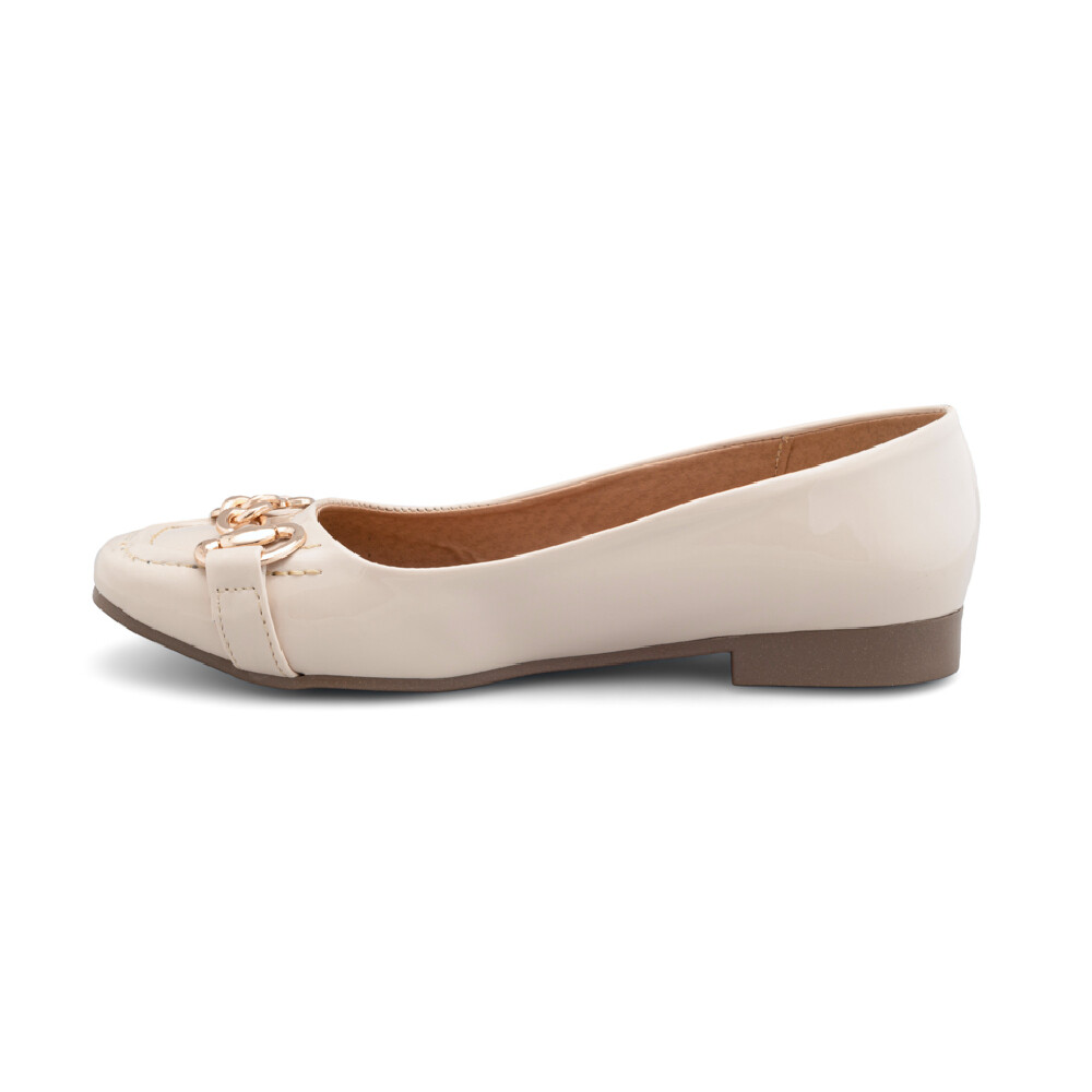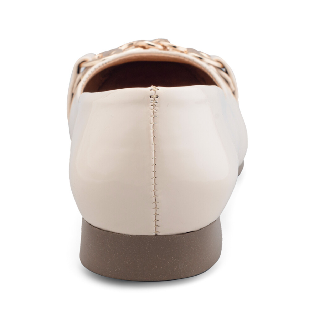 Mocasin De Charol Con Cadena diseñado para mujeres que buscan elegancia sin rigidez. Su acabado en charol crema brinda una presencia pulida, mientras que la cadena metálica y el pespunte en la punta añaden carácter al diseño sin volverlo excesivo. Su suela ligera y tacón bajo de 2 cm permiten usarlo durante todo el día, tanto en contextos formales como casuales, manteniendo siempre una estética refinada y femenina.